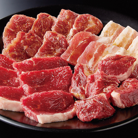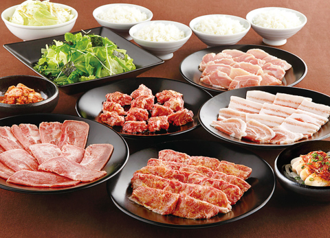 カップル、友人同士でどうぞ!!おトクな基本のセットです。/厚切りカルビ、ロース、ハラミ、熟成ドラゴンロース(豚)、さかいチョレギ、旨塩きゃべつ、中ライス、韓国のり