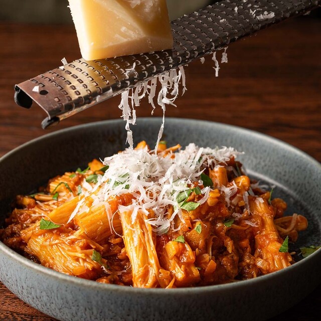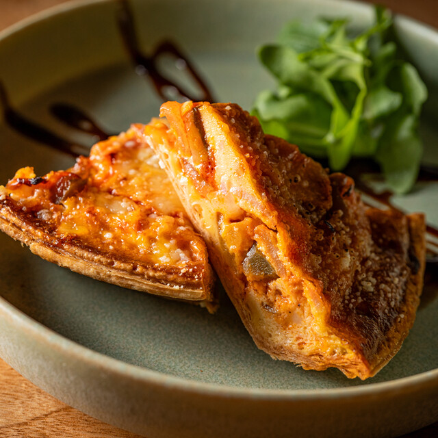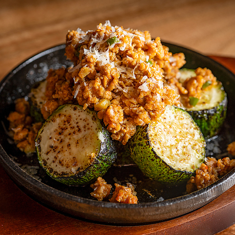宮崎県産の大きいズッキーニを贅沢に使用し、スパイシーなキーマカレーを乗せ丁寧に焼き上げます。お好みで白ラー油も最高に合います。