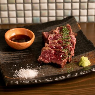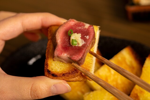 炭焼きと言うと、煙の中で串に刺さったお肉を楽しむイメージ…。しかしヒノコでは炭火で焼いてからフタをして蒸しあげる一風変わった独自のスタイル。食材が持つ水分で蒸すことで、肉はジューシー、野菜はふっくらな仕上がりを堪能。イチオシは「牛ハラミ」。塩やワサビ、オリジナル醤油タレで味わう、あっさりとした肉料理です。「炭蒸しトースト」は、パンメニューですがバターの風味が際立つお酒にも合う一品♪