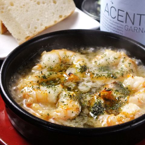 スペインの代表的なタパス、アヒージョ。定番のごろごろ大ぶりな海老のアヒージョ、タコとオリーブのアヒージョをはじめ、本日の特選素材のアヒージョも見逃せません。旨みが染み渡ったオイルで食べるパンがまた絶品。