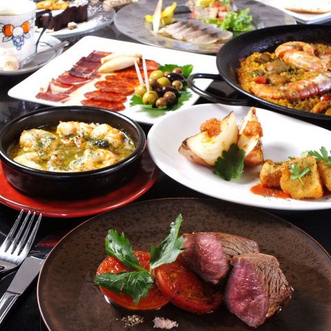 イベリコ生ハムとオリーブのプレート、前菜(冷・温)、海老のアヒージョ、イベリコ豚の鉄板焼き、ミックスパエリア、デザート全8品のアリオリの人気メニューをコースにいたしました。飲み放題は2000円でご利用いただけます。