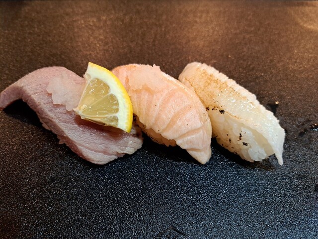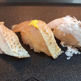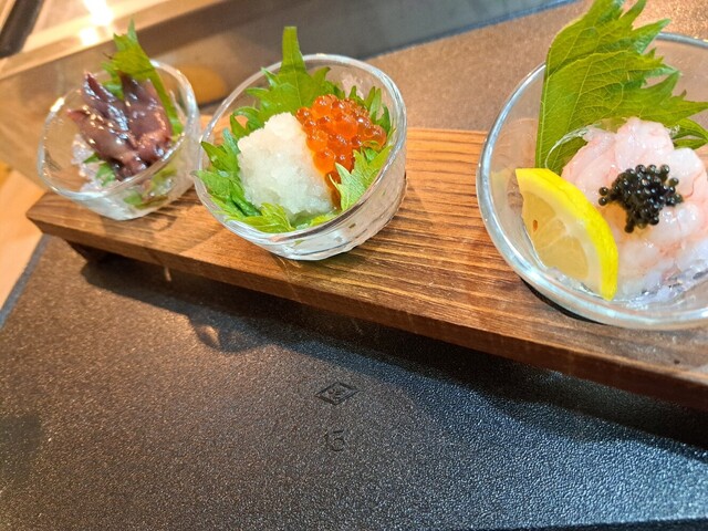 “北陸を応援したい”という想いをこめ、こだわりのお料理・お酒でおもてなし。北陸直送の季節の鮮魚が味わえるのが当店の自慢です。石川県や富山県の市場へ直接趣き、確かな目利きで仕入れ。白海老やガス海老、赤いかなど、その時期の旬の魚介をご提供いたします。特に金沢産の鮮度抜群ののどぐろは見逃せません。カウンターの目の前で、北陸出身の職人が握るお鮨をはじめ、本格的な逸品を心ゆくまでどうぞ。