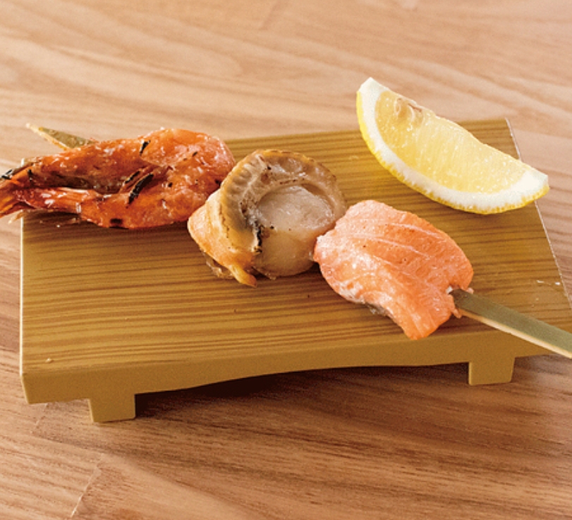 新鮮な海の幸を串に刺して焼き上げた海鮮串は、ジューシーで旨みたっぷり。丸かじり海老、ホタテ、鮭ハラスといった贅沢な具材が、焼きたての香りと共にお口の中で踊ります!ひと串ずつ丁寧に仕上げられた海鮮串は、食欲をそそる見た目も魅力のひとつです☆