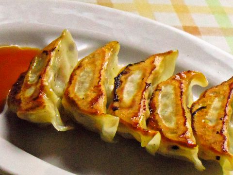国産野菜、国産豚のミンチを使った国産100%ギョーザ。皮はパリッと、中はジューシーで満足できるおいしさである。
