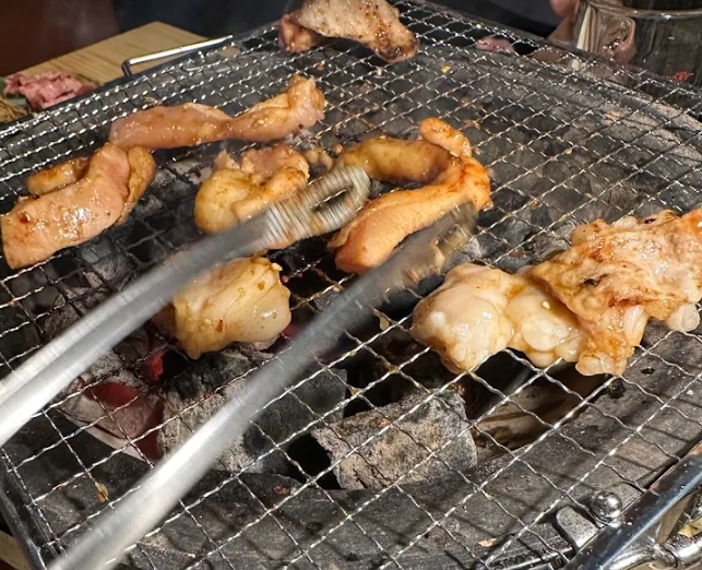 目の前の七輪で高級和牛や地元の錦爽鶏を自分好みに焼き上げる、臨場感あふれる焼肉居酒屋。ファミリーも団体も安心の座敷完備で、プライベート空間も充実しています。