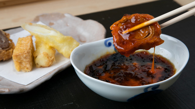 天麩羅のお魚は大阪湾の近海物を中心に、日本各地から旬の食材をただ揚げるだけではなく一手間加えた和の技法でお楽しみいただきます。季節を感じていただけるお野菜は旨味をぐっと衣の中に閉じ込めます。天麩羅の油はキレの良い綿実油を使っておりますので胃もたれせずお召し上がりいただけます。綿実油は油煙が出にくいので衣服への匂い移りも少ないです。