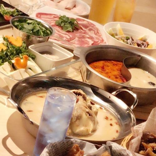 体の内側からきれいを目指せる薬膳火鍋やタッカンマリが人気。2色の薬膳スープで味わうしゃぶしゃぶや、鶏一羽を豪快に煮込んだコラーゲンたっぷりの鍋は、美容に敏感な方におすすめ。ヘルシー志向のダチョウ鍋やチーズ鍋も揃い、女子会にもぴったりのラインナップです。