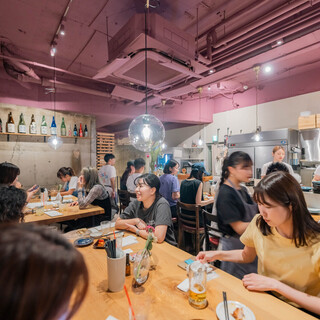 ゆっくりとお寛ぎいただけるよう、内観にもこだわりました。店内は、中央に設置されたカウンターの上に温かみのある電球色が灯り、リラックスムード漂う雰囲気。天然木一枚板の分厚いロングテーブルと、コンクリート打ちっ放しの壁が目を引きます。居心地の良いお洒落な空間は、お一人様や気心知れたご友人とのお食事、デート、ご宴会にも最適です。
