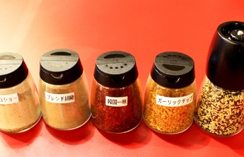 出来上がったラーメンにゴマ、韓国一味、ブレンド胡椒、白胡椒、ガーリックチップなどの調味料を加えることで、よりお好みの味に調整していただけます。
