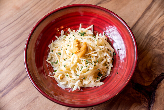 人気メニューのうにとじゃがいものクリーム炒めは、細切りポテトに濃厚な雲丹クリームがたっぷり絡む贅沢な味わい。ひと口食べればコク深い旨みが広がり、思わず笑顔に。こってり系が好きな方にもおすすめの満足感ある一品です。素材の組み合わせが光る、和と伊の絶妙なハーモニーを堪能できます。