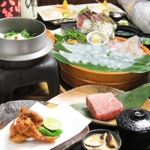 名物「泳ぎイカ」や「カツオの藁焼き」をはじめ、国産和牛、天然魚、四季折々の山幸・海幸…寅八商店自慢の美味はまずはコースで、余すことなくご堪能ください。初めての方におすすめは『寅八コース』。クーポンを使えば、飲み放題付でも6500円とお手頃★お腹が満たされる肉料理に揚げ物など、バランス良く楽しめます。