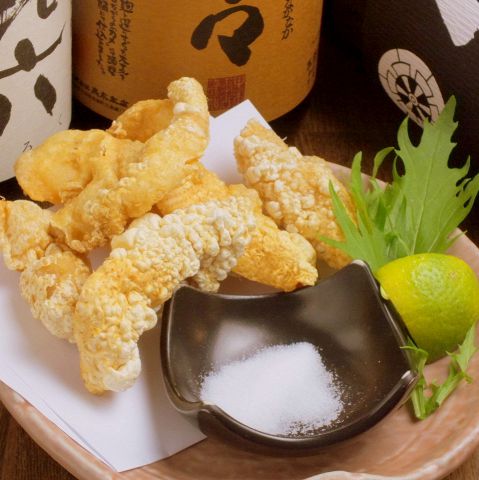 綺麗なキツネ色に揚がった鶏センベイ。パリッパリの食感をお楽しみください!美味しさの秘密は200度以上の油で、丁寧に3度揚げをしてお出ししている事。シンプルなメニューだからこそ、素材の旨みや技術を感じる一品です。