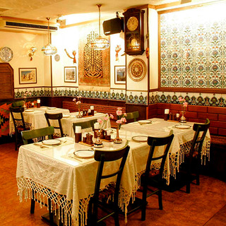 トルコブルーを基調とした内装に、カラフルなトルコの調度品や照明が彩りを添える店内。日本であることを忘れてしまいそうになる、オリエンタルムードたっぷりの空間がお迎えいたします!店内にはゆったりお食事をお楽しみいただけるテーブル席をご用意!