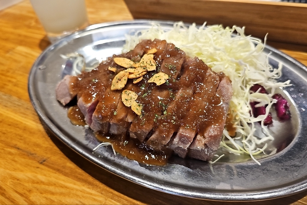300gのボリューム満点の厚切りトンテキは、豚の美味しさが凝縮されています。低温調理で柔らかく、絶妙なピンク色の断面が特徴です。