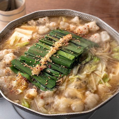 名物の「モツ鍋」には、鶏ガラ・豚骨をじっくりと炊き上げて作った特製スープを使用しております!醤油には安政2年(1855年)創業、福岡県博多の醤油屋ジョーキュウの醤油を使用!