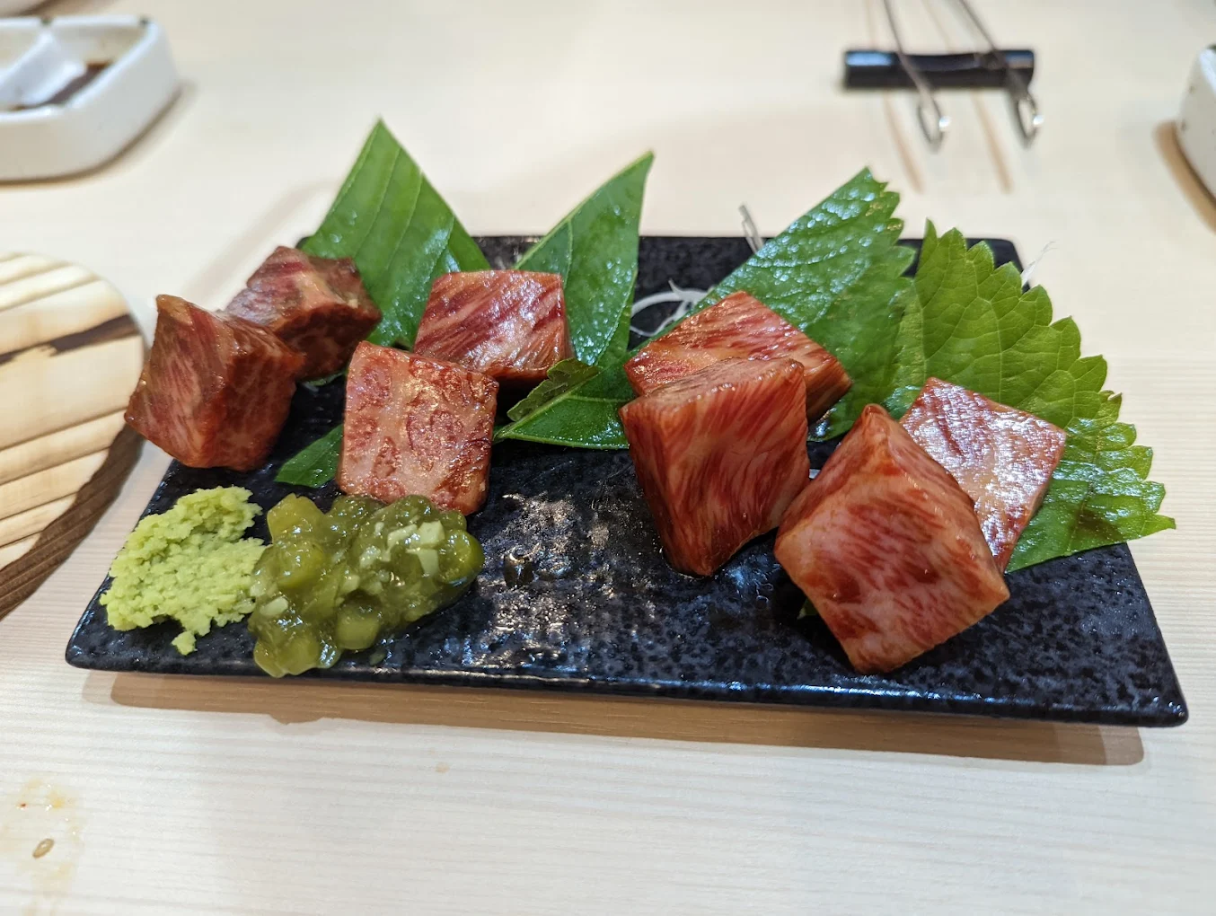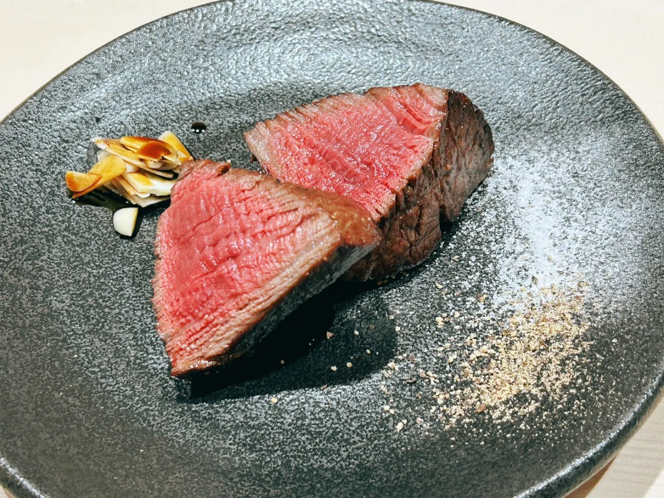 最初のタン元から始まり、ザブトン、テール、ハラミ、そしてシャトーブリアンへと続く流れはまさに芸術。焼き方、切り方、火入れ、すべてに店主の哲学が息づいています。特にテールの焼物は珍しく、その旨味と食感は一度食べたら忘れられない逸品です。