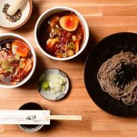 朝まで営業し、食べやすくて美味しいお店。ラー油の効いたつけ蕎麦が絶品で、胡麻は入れ放題!豚そぼろ丼や冷やし蕎麦に冷たいつけ汁も選べ、激辛追加も可能です♪