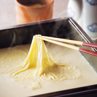 シルクのようになめらかな食感とまろやかな甘み、コクが魅力の「引き上げ湯葉」。身体も心も喜ぶ、優しい癒しと滋味あふれる味わいが魅力です。1枚1枚、出来立ての湯葉を堪能する貴重な体験を、ぜひお愉しみください。