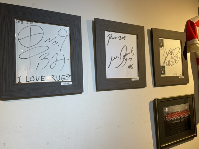 季節によって気持ちよく、美味しいコーヒーが楽しめる。店内にはラグビーのユニフォームとサインが飾られ、ラグビーファンにとっては特別な空間。