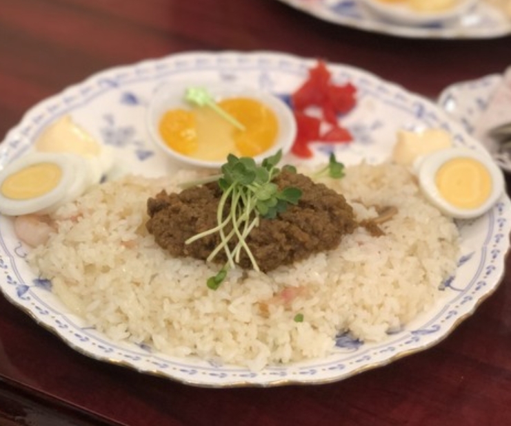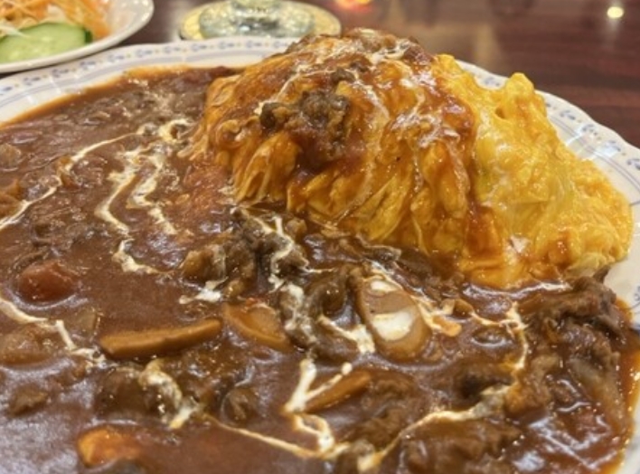ピラフの上にかけられたカレーは、程よい辛さと深い味わいが特徴。ゆで卵のスライスとマヨネーズで甘辛のバランスを調整し、繰り返し食べたくなる美味しさが広がります。まさに定番ランチにぴったりな一品。