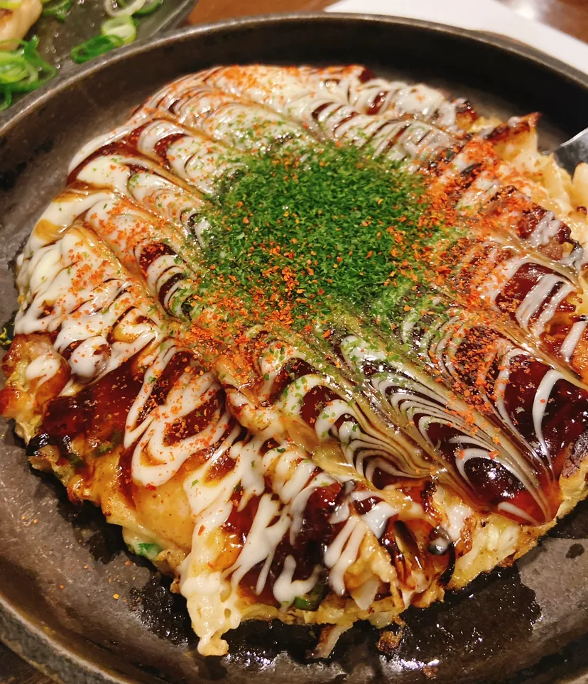 ふんわり甘いキャベツと豚バラ肉の旨みが絶妙に重なる、バランスの良いお好み焼き。オタフクソースのフルーティーな甘みが全体をまとめ、最後まで飽きずに楽しめます。鉄板で提供されるため、食べ終わるまで熱々。香ばしさとふんわり食感の両方を堪能できる一枚です。