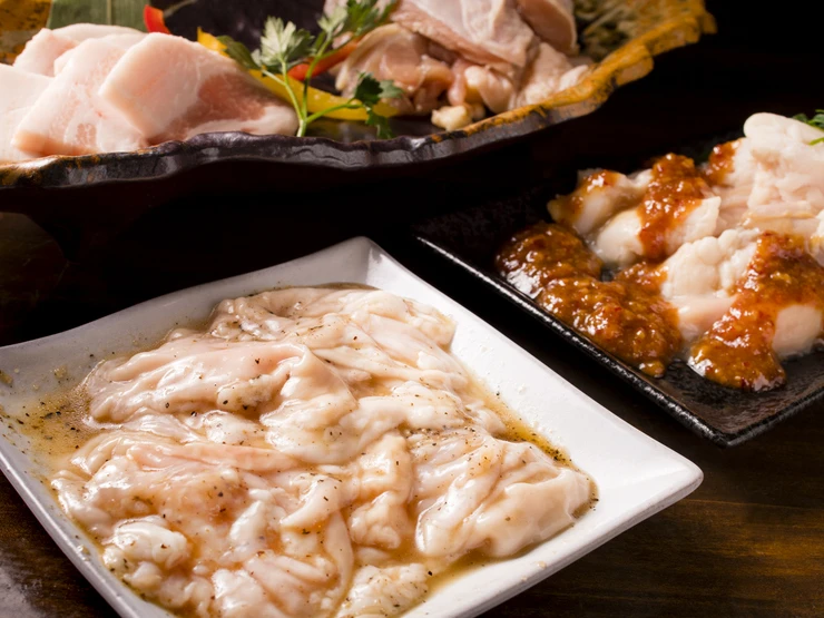 プリプリした食感がやみつきになる『とんちゃん(豚腸)』や口の中でとろけるような『トロホルモン(牛腸)』など、一度食べたら忘れられない逸品揃いです。自家製の「塩ダレ」「味噌ダレ」、秘伝の薬味でつくった「地獄・辛」の3種類のタレでご堪能ください。