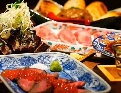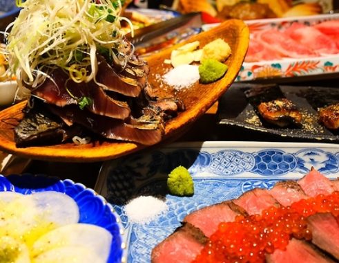 名物「鰹の塩タタキ」や「和牛炙り寿司」は、注文ごとに藁で豪快に炙る本格スタイル。素材の旨みと藁の香りが絶妙に絡み合う逸品をぜひご堪能ください。