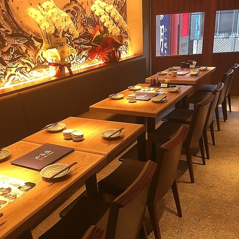 落ち着きのある和モダンな空間では、暖色のライトが心地よい雰囲気を演出します。お一人様やデートに最適なカウンター席は、調理風景を楽しめる特等席。プライベート感のある個室席も人気です。使い勝手の良いテーブル席もございますので、多彩なシーンにどうぞ。