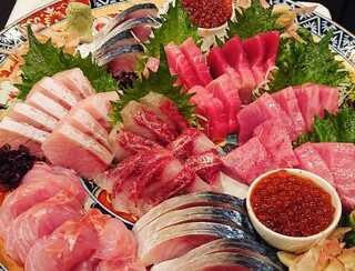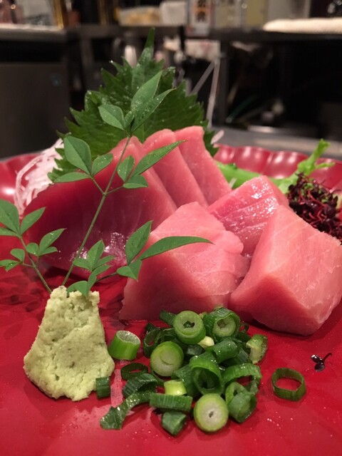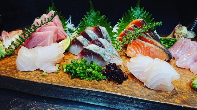 お造りの鉄板は、「生本鮪のお造り」。毎日仕入れている新鮮な魚10種類ほどからおまかせ盛り合わせ3種、4種、5種のご用意もございます!自家製の醤油でどうぞ。松阪牛は居酒屋では希少なA5ランク。名物の「松坂牛のタタキ」は、秘伝の醤油誰ダレと白いごま油がたまらない一品です!松阪牛はウニ巻きや炙り刺、焼き、炙り寿司と食べ方も豊富!