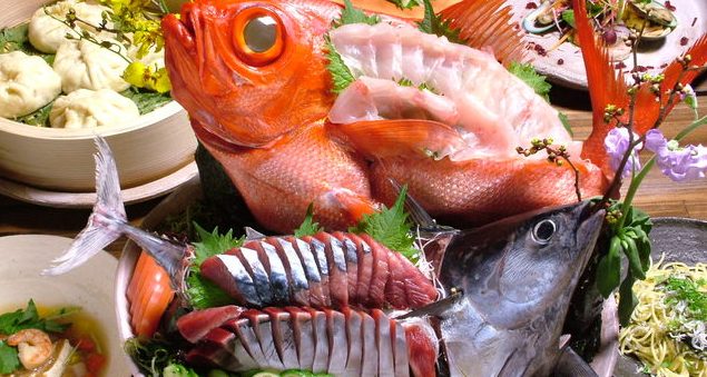 間接照明が灯る上質な和モダン空間で、心ゆくまでくつろげるダイニング。掘りごたつ付きの完全個室も多数あり、最大80名までの宴会にも対応。地元食材を活かしたコース料理は、旬の味覚を贅沢に取り入れた品々。飲み放題メニューは120種以上と豊富で、お酒好きも満足できる内容です。
