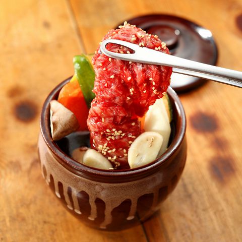 壺漬けカルビ(カルビ、焼き野菜入り)!特製ダレに漬け込んだ分厚いカルビとお野菜!壺から取り出す瞬間からわくわくが止まらない、大満足の逸品です!
