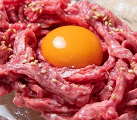 店主は認定生食用食肉取扱者で、生肉のご提供が可能。A5和牛を使った極上ユッケ刺しをご堪能ください。