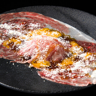 「和牛ローストビーフ」や「低温調理レバー」など、低温調理でお肉の旨味を引き出した一品料理も自慢です。なかでもイチ押しの「和牛サーロイン握り」は、20cmほどの和牛をシャリが見えなくなるほど贅沢に覆い、ワサビを添えた逸品。まるでトロのようにとろける脂の旨味と甘みが口いっぱいに広がります!