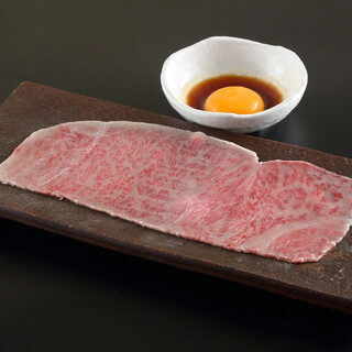 キメの細かい肉質で、適度なサシが入っており、柔らかくて旨みが凝縮された高級部位を赤身が残る程度にサッと炙り特製の月見ダレに絡めてお召し上がりください。口に入れた瞬間に広がり、とろける贅沢なお肉の味わいをぜひご堪能あれ。