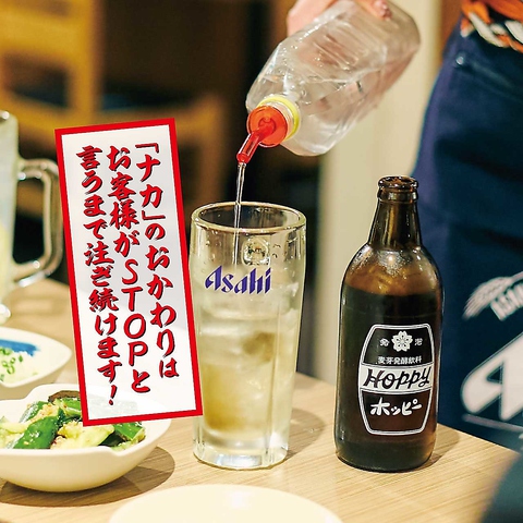ホッピー“中”のおかわりはお客様がストップというまで注ぎ続けます!これがやきとりセンター流のおもてなし!