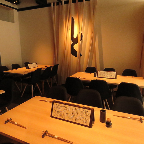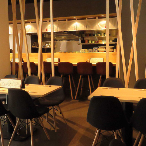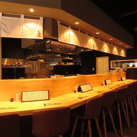 オーナーのこだわりあふれる店内は、木やライトの温かみがありながらもシックで大人な雰囲気。2名様以内なら、目の前で調理が見える自慢のカウンター席がおすすめです!お隣席との間にゆったりスペースをもたせたL字型の開放的なカウンタースペースで、お酒を片手にしっぽりと大人の時間をお過ごしください!