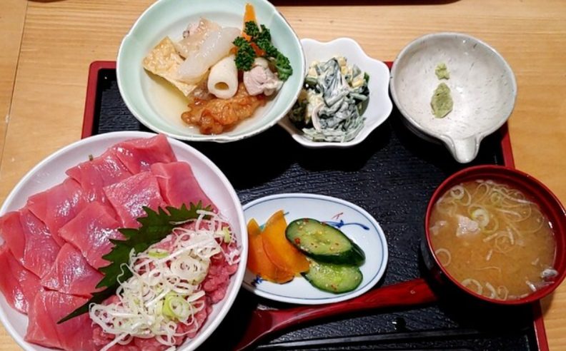 ランチは魚系と肉系の2種類を日替わりで用意。生本まぐろを使った贅沢な丼は赤身ながら程よく脂がのり、白米との相性も抜群。揚げ物や小鉢も新鮮で丁寧に作られており、満足度の高い内容です。ご飯おかわり自由で、男性にも女性にも嬉しいボリュームランチです。