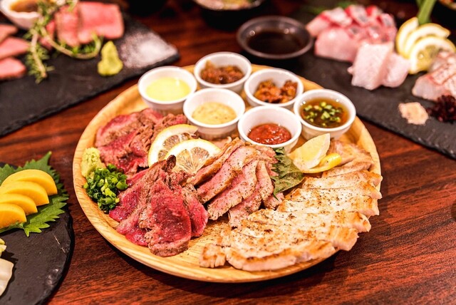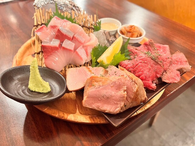 国産牛の肉盛りや博多もつ鍋、肉と魚の合い盛りなど多彩なメニューがあります♪四季折々の旬のお魚を活かしたお刺身もおすすめです!