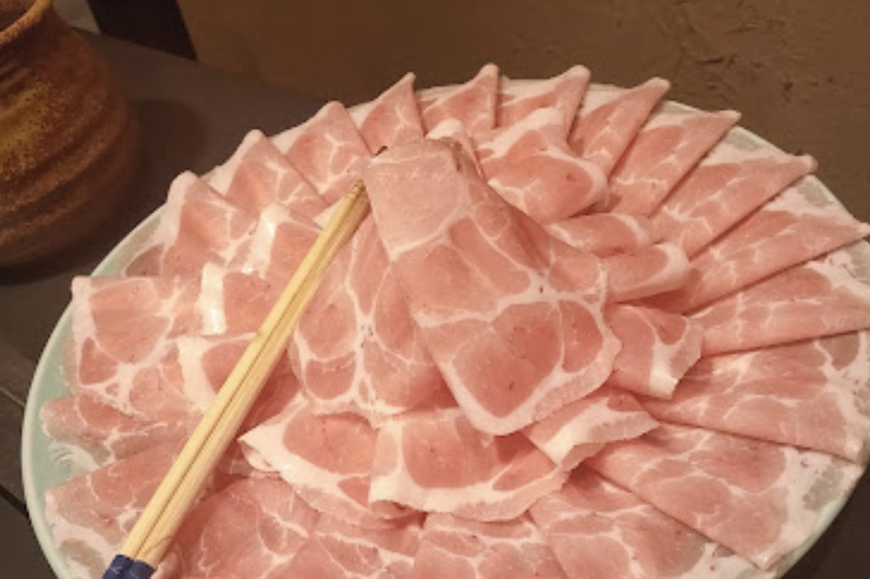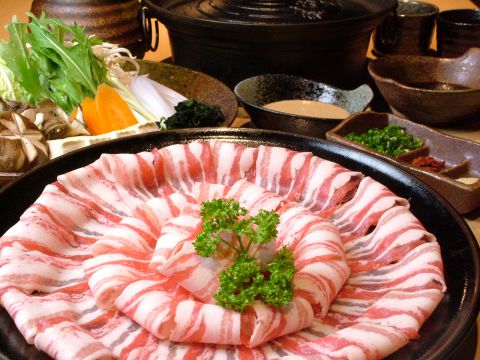 写真は豚しゃぶ富コースのお肉2人前。小鉢、特選豚、野菜、ご飯、味噌汁がついております!1人前2,180円とリーズナブルなお値段なのも嬉しい♪
