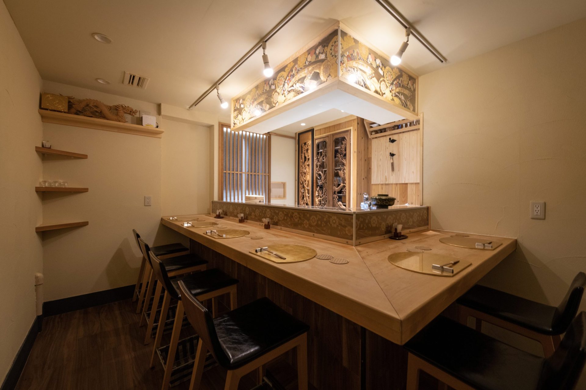 扉を開けると、木の温もりを感じる上質な和空間が広がります。店内には、目の前で調理する様子をお愉しみいただける会員用の檜のカウンター席と、プライベートな場面にも最適な個室を完備!