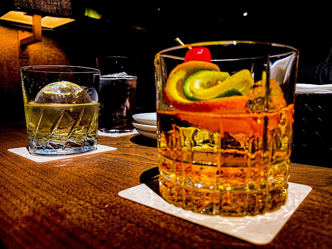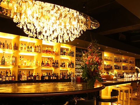 11mの黒御影石カウンターが圧巻の、落ち着きと高級感漂うバー。シャンデリアが照らす上質な空間で、豊富なカクテルやウイスキーを楽しみながら、大人のひとときを過ごせます。
