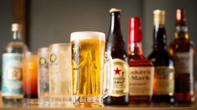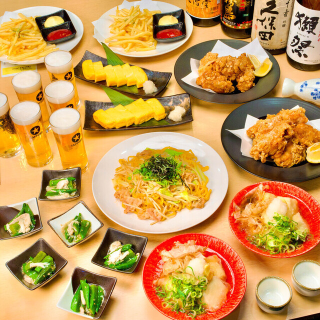 生ビールはサッポロ黒ラベル、瓶ビールは赤星をご用意。角ハイボールや焼酎、レモンサワーなど80種類が楽しめる単品飲み放題は60分1,300円とお得です。L字型の店内は最大54名様まで対応可能で、団体利用や女子会にも最適。早割や時間限定メニューもあり、時間帯によってさらにお得に楽しめます。